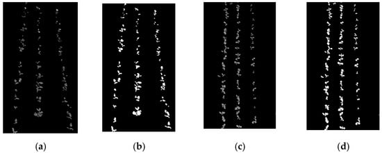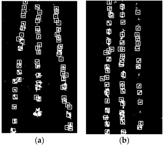 In the image pre-processing process, due to the possible uneven distribution of artificially sown soybean seedlings, there will be a situation in which multiple soybean seedlings are connected together, binarised as in the connected region of Figure 10d, while the outer connecting rectangle is unable to box in the whole region due to the pre-set area threshold, resulting in the loss of feature points, which can be solved by adjusting the threshold value. At the same time, the emergence of the lack of seedlings and broken rows will also affect the subsequent research; the number of extractable feature points becomes less, and the clustered feature points have an impact on the accuracy of straight-line fitting, which may result in offset and recognition failure.