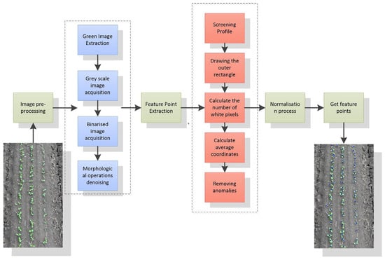 The extraction of feature points plays a crucial role in the process of crop row centreline extraction, as the spatial distribution of these points directly influences the determination of the crop row centreline position. Zhang et al. [] extracted SUSAN corner points as feature points and combined improved sequential clustering with Hough transform to detect the row centreline of seedlings. In Zhai et al. [], a binocular vision-based multi-crop row detection algorithm is proposed, which calculates the feature points based on the spatial location characteristics of crop rows using a stereo-feature-matching algorithm and detects the centre line of crop rows using a composite method based on PCA and RANSAC methods. An adaptive multi-region of interest (multi-ROI)-based crop-row-detection algorithm is proposed by Zhou et al. [], where the image is divided into several regions. The feature points are obtained by moving the ROI window, and the navigation lines are fitted using the least squares method. The feature point extraction methods proposed by the above scholars include the corner detection method, stereo-feature-matching method, adaptive region of interest, etc. However, the above methods have the problems of decreasing accuracy and poor robustness when the crop rows are too short. Therefore, there is an urgent need to propose a feature point extraction method that can accurately extract feature points and does not affect the accuracy and robustness when the crop rows are short.