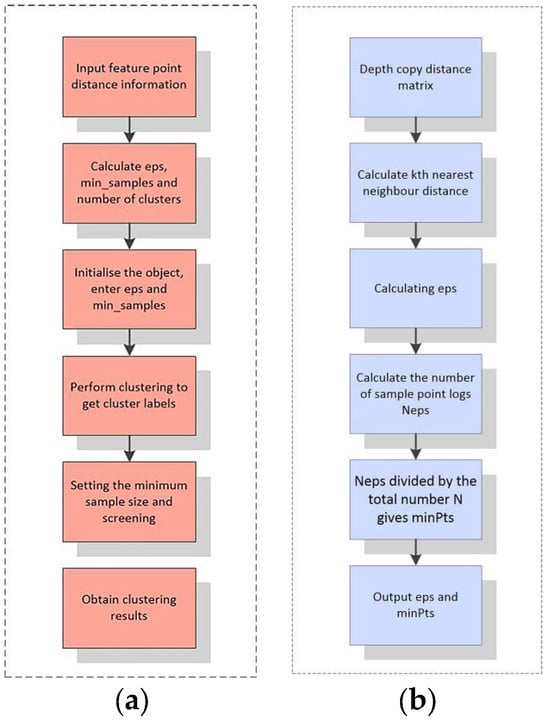 Adaptive DBSCAN clustering process: (a) general flow chart; (b) eps and mimPts calculation process.