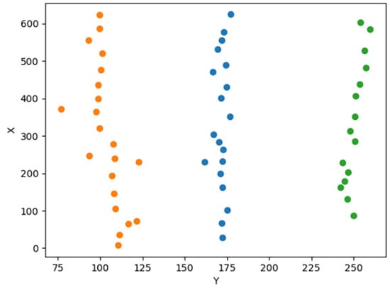 Among them, N is the total number of sample points, and Dk(i) is the kth nearest distance of the ith sample point. After obtaining the neighbourhood radius, we calculate the logarithm of the number of sample points with distances less than or equal to eps, denoted as Neps, and divide it by the total number of sample points N to obtain the minimum sample size. Finally, through clustering, feature points are divided into multiple clusters and labelled with different colours. Figure 8 shows the clustering results outputted by PyCharm. The identified crop row feature points in orange, blue, and green colours depict the spatial distribution of three rows of soybean seedlings within the planar coordinate system. The identified crop row feature points in orange, blue, and green colours depict the spatial distribution of three rows of soybean seedlings within the planar coordinate system. The identified crop row feature points in orange, blue, and green colours depict the spatial distribution of three rows of soybean seedlings within the planar coordinate system. These points are visualised as graphs in the PyCharm interface, facilitating easy observation of their distribution and clustering results.