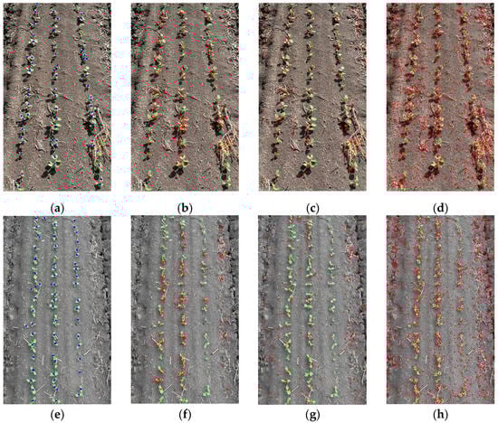 Characteristic point clustering of soybean seedling bands: (a) sunny day, 45° angle to the ground raw image, feature point extraction results; (b) sunny day, 45° angle to the ground raw image, clustering results; (c) sunny day, 0° angle to the ground raw image, feature point extraction results; (d) sunny day, 0° angle to the ground raw image, clustering results; (e) cloudy, 0° angle to the ground raw image, with straw, feature point extraction results; (f) cloudy, 0° angle to the ground raw image, with straw, clustering results; (g) sunny day, 90° angle to the ground, with straw raw image, feature point extraction results; (h) sunny day, 90° angle to the ground, with straw raw image, clustering results.