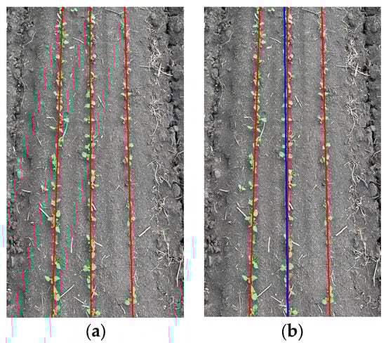In this study, the least squares method is used to fit the soybean seedling belt feature points to obtain the crop row centre line and navigation line, and the fitting results are shown in Figure 13, where the straight red line in Figure 13a is the fitting result of the crop row centre line, and the straight blue line in Figure 13b is the result of the navigation line extraction. From the results, it can be concluded that the method proposed in this paper can accurately extract the navigation lines between the rows of seedling soybeans for smart agricultural equipment.