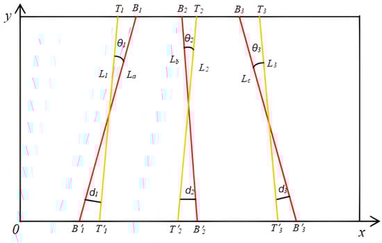 θ1 distinguishes between positive and negative values, which can indicate the relative position of L1 and La, and thus the angular deviation value; absθ1 is the absolute value of θ1, which can indicate the degree of angular deviation. Meanwhile, the distance deviation distance d1, d2, d3 from the standard line to the fitted straight line is calculated, and the distance deviation from the endpoints B1, B2, B3 of the fitted straight line to the standard line L1, L2, L3 is calculated by using the formula of the distance from a point to a straight line as in Equation (16):
