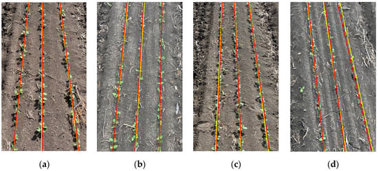 The meaning and calculation method of each group of straight-line parameters are the same. The distance deviation of each group of straight lines is averaged as the accuracy verification parameter for each image denoted by Avgd. The accuracy verification parameter for angular difference has the mean value of θ calculated for the three sets of straight lines and is denoted by Avgθ. The corresponding absAvgθ is calculated from the mean of absθ1, absθ2, and absθ3. Avgθ and absAvgθ denote the angular difference value of the overall image and the degree of deviation in the overall image, respectively. Through the distance deviation analysis and angular difference analysis, the coincidence rate between the centre line of the fitted crop rows and the standard line was calculated to obtain the accuracy of the navigation line fitting A. Figure 15 shows the accuracy validation results of the images taken from the samples, where the straight red line is the result of the crop row fitting and the straight yellow line is the standard line. Figure 15a is the verification result of the image with 45° angle to the ground in sunny weather; Figure 15b is the verification result of the image with 45° inclination to the ground in cloudy weather; Figure 15c is the verification result of the image with 45° multi-straw in sunny weather; and Figure 15d is the verification result of the image with 45° inclination and lack of seedling in cloudy weather, and from the results, it can be seen that under the interference of the factors of sunny weather, cloudy weather, and multi-straw, the accuracy is still higher than the accuracy of the fit changes when there is a lack of seedlings in the image.