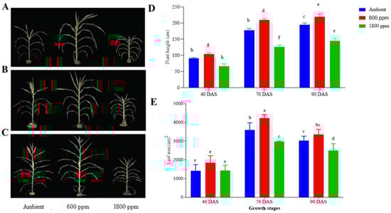 The maize plants were grown for up to 13 weeks under ambient CO2 conditions (380 ± 20 ppm CO2) or with varying levels of CO2 enrichment (600 ± 20 ppm and 1800 ± 20 ppm CO2). Throughout each growth stage, the plants subjected to CO2 enrichment exhibited distinct morphological changes compared to those grown under ambient CO2 conditions (Figure 2A–C). Notably, the maize plants grown with CO2 enrichment at 600 ppm were taller than those grown under ambient CO2 conditions, despite having the same number of leaves. In contrast, the plants grown at 1800 ppm CO2 were shorter in height than those grown under ambient conditions. The CO2 enrichment at 600 ppm increased the plant height by 13.47%, 23.61%, and 8.83% at each harvest stage, while at 1800 ppm, the plant height decreased by 65.71%, 30.77%, and 24.26% after 40, 70, and 90 DAS, respectively.