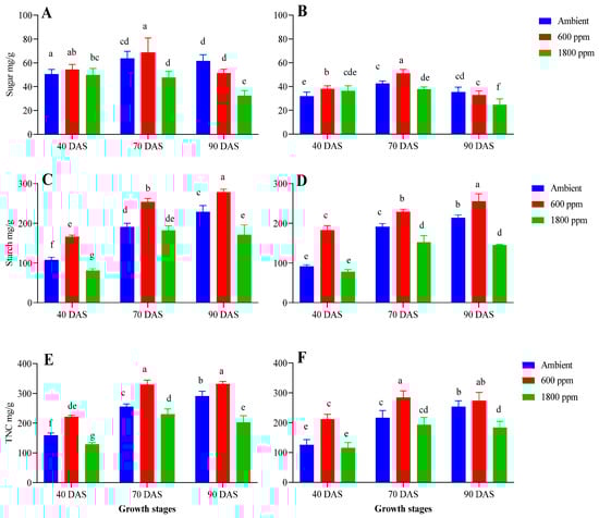 Effects of ambient and elevated CO2 on soluble sugar in leaf (A), stem (B), starch in leaf (C), stem (D), TNC in leaf (E), and stem (F) at different growth stages (40, 70, and 90 DAS). Different letters indicate significant differences at p < 0.05.