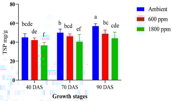 Effects of ambient and elevated CO2 on total soluble protein at different growth stages (40, 70, and 90 DAS). Different letters indicate significant differences at p < 0.05.