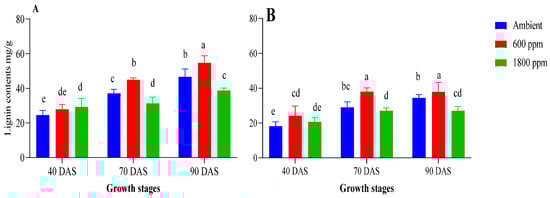 Effects of ambient and elevated CO2 at different growth stages (40, 70, and 90 DAS) on lignin accumulation in maize leaf (A) and stem (B), Different letters indicate significant differences at p < 0.05.