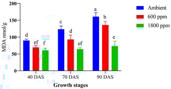 MDA is a product of membrane lipid peroxidation and serves as a crucial indicator of cellular membrane damage under stress conditions. In this study, as the CO2 levels increased across different treatments and growth stages, the MDA content in the maize exhibited a significant decrease (Figure 6). Specifically, at each harvest, the MDA content consistently decreased with increasing CO2 concentrations. At 40 DAS, the MDA contents decreased by 22.8% and 32.8% at 600 ppm and 1800 ppm CO2, respectively. At 70 DAS, the MDA contents decreased by 24.5% and 47.9% under the same respective treatments. Similarly, at 90 DAS, the MDA contents decreased by 16.6% and 54.5% at 600 ppm and 1800 ppm CO2 levels, respectively.