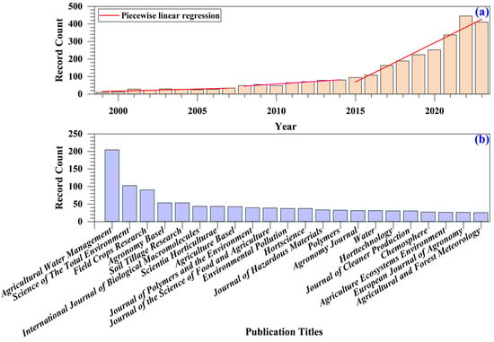 Distribution of articles pertaining to drip irrigation under plastic mulch (DIPM) by year and by major journals. (a) represents the number of articles published in different years. (b) represents the specific number of articles in journals with more than 25 articles.