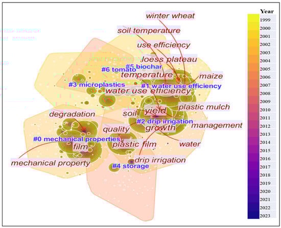 Furthermore, we categorized the keywords into seven main groups: #0 mechanical properties, #1 water use efficiency, #2 drip irrigation, #3 microplastics, #4 storage, #5 biochar, and #6 tomato. Group #3, “microplastics”, appearing in the keyword clustering came as a surprise, indicating that researchers are now aware of the serious harm caused by the long-term use of plastic mulching in farmland. The application of biochar in DIPM fields is suggested as an effective strategy to reduce greenhouse gas emissions, improve soil fertility, and increase crop yield, which has also sparked the interest of many researchers [22,23,24].