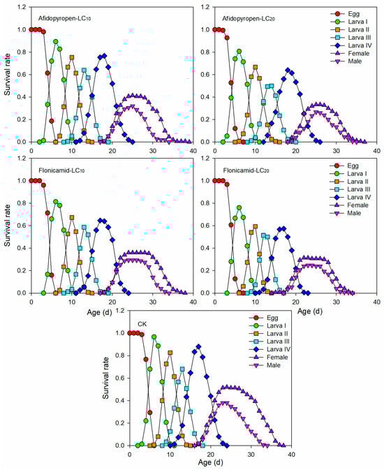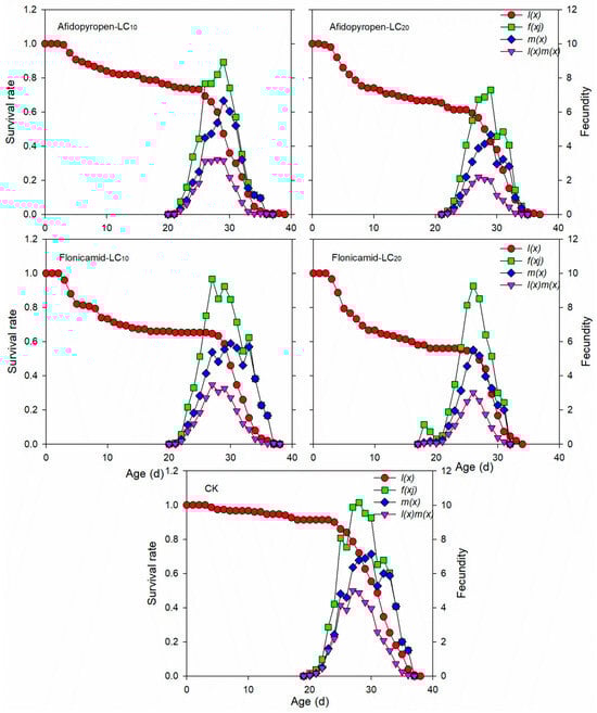The results of age–stage-specific survival rate (Sxj) also indicated that the survival rate decreased, development was delayed, and longevity was shortened (Figure 1). For LC20 and LC10 afidopyropen treatments, the peak period of adult emergence was at the 26th to 27th d and 24th to 25th d, respectively, while it was the 22nd to 23rd d in the control. For flonicamid treatments, the peak period of adult emergence was at the 22nd to 23rd d and 23rd to 24th d, respectively. The survival time of female adults was from the 20th to 36th d and the 20th to 39th d for LC20 and LC10 afidopyropen treatments, respectively. Survival ranged from the 19th to 38th d and the 17th to 34th d for the LC20 and LC10 flonicamid treatments, respectively, which are shorter periods than those of the control (17th to 37th d).