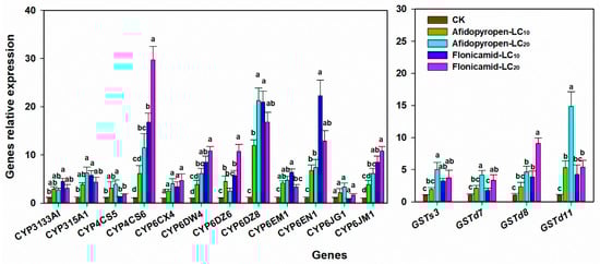 Gene expression levels related to P450 and GSTs of B. tabaci adults treated by flonicamid and afidopyropen. Each value represents the mean (±SE) of three replications, and different letters over the bars indicate significant differences at p < 0.05 (Tukey’s HSD).