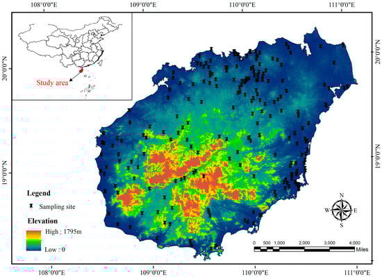 Hainan Island is located northwest of the South China Sea (108°36′ E–111°3′ E, 18°10′ N–20°10′ N). It has a gross area of 354 km2, and the region is characterized as a tropical oceanic monsoon with ample light and heat energy [29]. The island’s topography features low-lying areas surrounding a central highland, resulting in a dome-shaped mountainous terrain. Landforms include mountains, hills, plateaus, and plains, forming distinct tiered structures. Favorable climatic conditions have given rise to valuable mineral resources on the island, including bauxite, coastal sand minerals, gem sand minerals, and leached-type rare-earth minerals, shaped over time by the maritime tropical monsoon climate. Hainan Island is an important agricultural production area in China, with frequent population movements and a concentration of agricultural related activities; at the same time, it has a unique natural environment and abundant medical, tourism, health, cultural, and other resources, making it a world-famous longevity island and base for international tourism and health demonstration. Industrial activities in Hainan Island are relatively weak, especially as the introduction of industries with serious pollution issues such as those that are “heavy metal-related” has been restricted, which creates a solid foundation for the development of the tourism and health industries.
