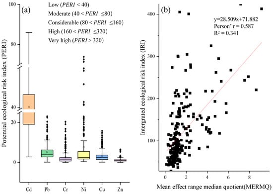 (a) Potential ecological risk index (PERI) and (b) linear regression between the integrated risk index (IRI) and the mean effect range quotient (MERMQ).