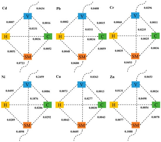 The direct and indirect risk flow diagraph from six heavy metals in paddy soils of the study area. (Note: Blue “represents” “vegetation”, abbreviated as “V”; Yellow “represents” “herbivores” and is abbreviated as “H”; Green “represents” “carnivores”, abbreviated as “C”; Orange “represents” “soil microorganisms”, abbreviated as “SM”).