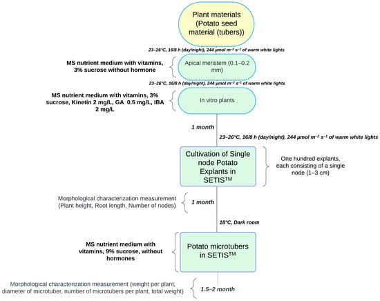 Flowchart detailing the different production steps for potato microtubers in a SETISTM system.