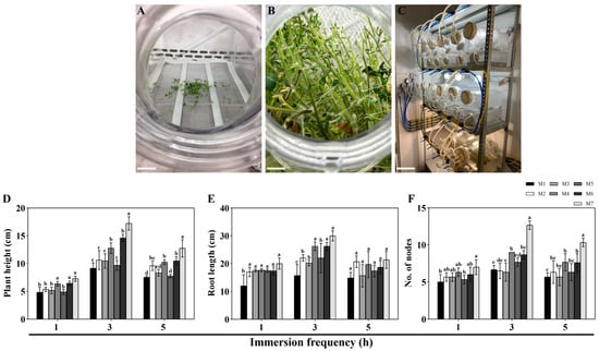 Morphological characteristics of potato plants depending on different nutrient media and immersion frequencies of Gala potato variety. (A) Single-node potato explants obtained from one-month cloned regenerants (1–3 cm). (B) Active growth of potato plants (2–3 weeks). (C) Rack with SETISTM bioreactors (3–4 weeks). (D) Plant height. (E) Root length. (F) Number of nodes. Data are means ± standard deviations of three biological replicates. M1 (without hormones), M2 (kinetin 0 mg/L, GA 0.5 mg/L, IBA 0 mg/L), M3 (kinetin 2 mg/L, GA 0 mg/L, IBA 0 mg/L), M4 (kinetin 2 mg/L, GA 0.5 mg/L, IBA 0 mg/L), M5 (kinetin 0 mg/L, GA 0 mg/L, IBA 0.5 mg/L), M6 (kinetin 0 mg/L, GA 0.5 mg/L, IBA 0.5 mg/L), and M7 (kinetin 2 mg/L, GA 0.5 mg/L, IBA 0.5 mg/L). Scale bar: 1 cm. According to the Duncan test, different letters above the bars indicate significant differences (p < 0.05).
