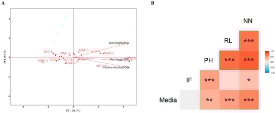 Principal component analysis (PCA) (A). (B) Pearson’s correlation analysis examining morphological characteristics under different nutrient media and immersion frequencies. The blue and red colors correspond to positive and negative correlations, respectively. IF—immersion frequency; PH—plant height; RL—root length; and NN—number of nodes. *, p < 0.05; **, p < 0.01; and ***, p < 0.001.