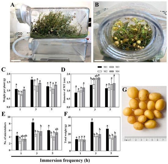 It was found that the best microtuber WP, DM, NMP, and TW of the MTs were achieved with a 3 h immersion frequency and M1 nutrient medium (Figure 4C–F). With nutrient medium M1 (without hormones), the WP reached 1.6 ± 0.03 g, the NMP was 8.33 ± 0.5 pcs, and the TW of the MTs was 34.0 ± 1.7 g. However, the DM was the smallest, amounting to 1.3 ± 0.3 cm in M1 and M2, whereas DM values of 1.7 ± 0.05 cm and 1.8 ± 1.1 cm were observed in M3 and M4, respectively.