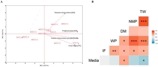 Principal component analysis (PCA) (A). (B) Pearson’s correlation analysis between morphological characteristics under different nutrient media and immersion frequencies. The blue and red colors correspond to positive and negative correlations, respectively. IF—immersion frequency; WP—weight of microtubers per plant; DM—diameter of microtuber; NMP—number of microtubers per plant; and TW—total weight. *, p < 0.05; **, p < 0.01; and ***, p < 0.001.