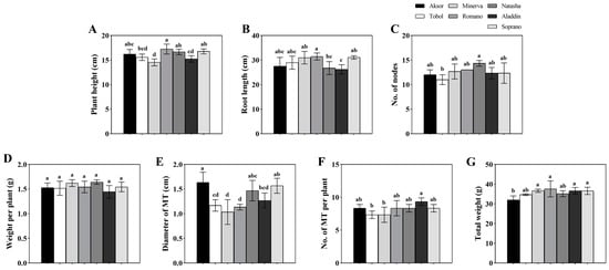 Morphological characteristics of plants of seven potato varieties. (A) Plant height. (B) Root length. (C) Number of nodes. (D) Weight of microtubers per plant. (E) Diameter of microtuber. (F) Number of microtubers per plant. (G) Total weight. All morphological characterization data were collected after 4–5 weeks of culturing in the SETISTM system. Data are means ± standard deviations of three biological replicates. According to the Duncan test, different letters above the bars indicate significant differences (p < 0.05).