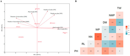 According to the PCA, the first two components, PC1 (34.9%) and PC2 (25.4%), made the most significant contribution, accounting for 60.3% of the total variance in the potato morphological parameters and thus confirming the trend in the results (Figure 7A). The results revealed that the optimized nutrient medium and immersion frequency had the most significant effect on varieties such as Aksor, Soprano, Natasha, Romano, and Minerva; they had a less significant effect on the Aladdin and Tobol varieties. A high positive correlation was observed between PH and DM (r = 0.483), RL and TW (r = 0.501), and NN and WP (r = 0.734), whereas a negative correlation was identified between RL and NMP (r = −0.515), WP and NMP (r = −0.533), and DM and TW (r = −0.547) (Figure 7B).
