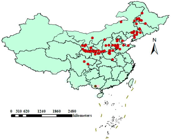This study employs meta-analysis to investigate the effects of straw incorporation on maize yield and water use efficiency under different production conditions. Using keywords such as “maize”, “corn”, “straw incorporation”, “yield”, “water use efficiency” and “China”, we searched for the literature published before December 2023 from databases including China National Knowledge Infrastructure (CNKI), Google Scholar, Web of Science, and Science-Hub. The selection criteria were as follows: (1) The study area is in China, and the experimental procedures are clearly documented, including time, location, and management practices. (2) The experiment includes at least one treatment group with no straw incorporation and one with straw incorporation, with other field conditions being consistent. (3) The study provides data on maize yield, water consumption, or water use efficiency, with sample size and standard deviation available. Based on these criteria, we collected 125 published Chinese and English articles, including 67 Chinese articles and 58 English articles, obtaining 659 sets of yield data and 485 sets of water use efficiency data. The distribution map of the experimental regions from the selected literature is shown in Figure 1.