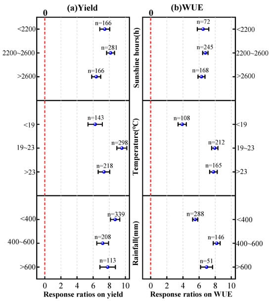 Straw incorporation has a regulatory effect on soil temperature, reducing the adverse effects of drastic temperature changes on crops [25,26]. As the average temperature during the growing season increases, the impact of straw incorporation on maize yield and water use efficiency initially increases and then decreases. Compared to regions with a growing season average temperature <19 °C and >23 °C, straw incorporation significantly improves maize yield and water use efficiency when the average temperature during the growing season is between 19–23 °C, with increases of 9.56% (95% CI = 8.94–10.18%) and 7.95% (95% CI = 7.57–8.34%), respectively. The enhancement effect of straw incorporation on maize yield and water use efficiency increases initially and then decreases with the increase in annual sunshine hours. In regions with annual sunshine hours between 2200–2600, straw incorporation significantly promotes yield and water use efficiency, with increases of 8.16 ± 0.49% and 6.78 ± 0.33%, respectively.