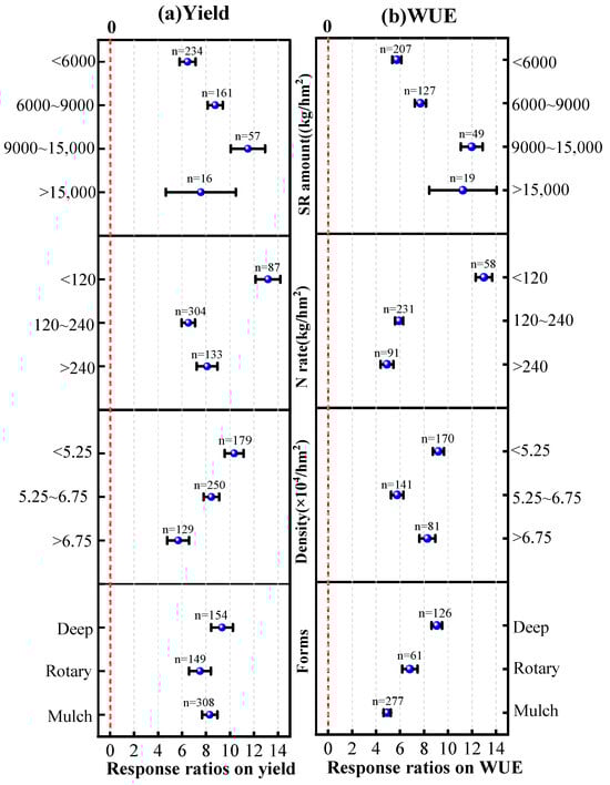 With the increase in cumulative rainfall during the growing season, the impact of straw incorporation on maize yield initially decreases and then increases (Figure 3a), while the impact on water use efficiency initially increases and then decreases (Figure 3b). In areas with growing season rainfall < 400 mm, straw incorporation significantly increases maize yield but does not markedly improve water use efficiency. When the growing season rainfall is between 400–600 mm, straw incorporation increases maize yield and significantly improves water use efficiency, with increases of 7.18% and 8.19%, respectively. In regions with rainfall > 600 mm, the effects of straw incorporation on yield and water use efficiency are not as pronounced compared to other areas.