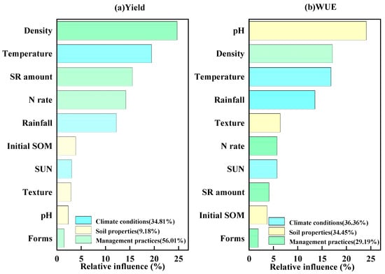 The relative importance of variables in maize yield and water use efficiency response to straw incorporation. (a) shows the relative importance ranking of factors influencing changes in maize yield under straw incorporation. (b) shows the relative importance ranking of factors influencing changes in maize water use efficiency (WUE) under straw incorporation. The different colors in the figures represent various production conditions: blue for climatic factors, yellow for soil conditions, and green for field management practices.