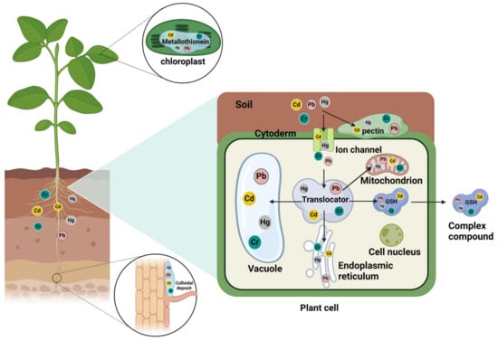 At the cellular level, heavy metals primarily interact with the cell wall of plant cells through physical adsorption or chemical bonding. Components such as pectin and cellulose in the cell wall possess a high affinity for heavy metal ions, leading to their binding and formation of complexes or precipitates. This immobilizes heavy metal ions on the surface of the cell wall (Figure 1), limiting their entry into the cell and thus mitigating their harmful effects on plant cells [18]. A fraction of the heavy metal ions will permeate the membranes of root hair cells, entering the cytoplasm through Fe carrier proteins, ion channels, and ion pumps [19]. Subsequently, within the cytoplasm, transport proteins facilitate the further transport of heavy metal ions to different organelles, including chloroplasts, mitochondria, and the endoplasmic reticulum (Figure 1). The accumulation of heavy metal ions in these organelles significantly contributes to their toxicity. For instance, metallothionein in chloroplasts can bind heavy metal ions, forming stable chelates, thereby alleviating the detrimental effects of heavy metal ions on chloroplasts and minimizing their impact on photosynthesis [20]. Additionally, intracellular chelators, such as glutathione (GSH), are utilized by plant cells to form complexes with heavy metal ions, reducing their toxicity. This chelation process aids in stabilizing heavy metal ions, which are subsequently transported to the cell wall or roots for excretion through transport proteins [21].