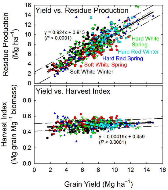 Figure 1 graphically illustrates the relationships of grain yield with residue production and HI. This analysis was performed by integrating data from all wheat classes together, since the classes were studied in separate experimental designs. The associated regression results are given mathematically in Table 5. This analysis was performed to enable simple estimation of wheat residue production from grain yield, since yield is the most widely measured and reported metric for wheat production. The regression results indicate that residue production of about 0.92 Mg ha−1 would be expected even when grain yield is zero. The results further indicate that for each 1.0 Mg ha−1 increase in yield, residue production will increase by about 0.92 Mg ha−1. Correspondingly, the slope for the relationship between grain yield and HI was slightly positive (significantly different and greater than zero), further indicating that the amount of grain produced relative to residue increases somewhat with increasing yield. For example, using the equation presented in Table 5, HI values of approximately 0.47, 0.48, 0.50, and 0.51 would be expected at yields of 3.0, 6.0, 9.0, and 12 Mg ha−1, respectively.