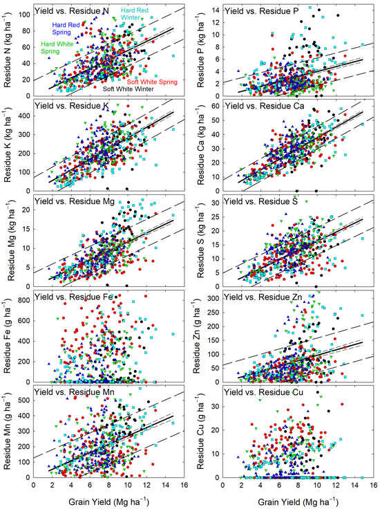 Uptake of 10 mineral nutrients in wheat residue as a function of grain yield for data collected in Southern Idaho in the 2018 and 2019 growing seasons. The differently colored symbols represent different classes of wheat, as indicated by the color of the wheat class labels. The solid lines are regression results, the short-dashed lines are 95% confidence intervals, and the long-dashed lines are the regression results plus and minus the root mean square error (RMSE) (Table 7). No statistical results were generated for Fe and Cu due to analytical issues.