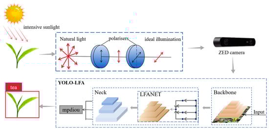 Although many scholars have conducted extensive research on the detection models of tea shoots, it has been found that the detection accuracy of these models decreases significantly under intense light (light intensity greater than) in practical applications. In this study, based on the dataset obtained by adding different polarisers under strong outdoor light, a YOLOv5 detection model based on polariser filtering combined with the LFAnet network is proposed, and the mpdiou loss function is introduced to enhance the detection accuracy of the model under an intense light environment and to achieve a reduction in the detection rate of tea shoots under intense light under the condition that the number of parameters, depth, and width of the model remain unchanged, to provide a new solution for the research and development of tea shoots under intense light. It also reduces the leakage detection rate of tea shoots under intense light with the same number of parameters, depth, and width and provides technical support for the development of an accurate outdoor tea shoot picking machine. The technical implementation process is shown in Figure 1.