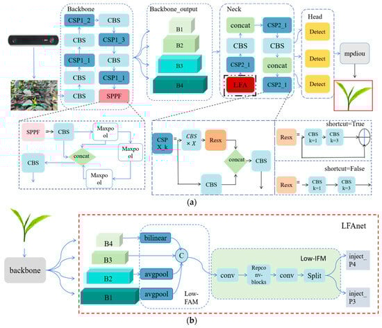 Based on the above research, even after it has been processed by the polariser, the accuracy cannot meet the requirements of automatic tea picking. In this study, we propose a method that focuses on the extraction of low-level features (LFA), as shown in Figure 3. In this paper, the results obtained after feature fusion (SPPF) of the spatial pyramid pooling structure in the backbone module of YOLOv5 algorithm module are inputted into the neck module, and the up-sampling link of the neck module is set to be the Lowlevel Feature Alignment (LFA) structure of this paper, and the final iou loss function is replaced by mpdiou, as in Figure 3a.