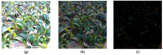 Segmentation based on pixel-level image processing [] is widely used for early tea bud recognition. Zhang et al. implemented the recognition of tea bud tips in the natural environment based on the colour factor method and used raster projection contours to obtain information on tea bud tip height. Yang et al. used the G component as the colour feature in the dual-threshold segmentation of background and tea buds and detected the edges of tea leaves based on shape features. Zhang et al. used an improved G-B algorithm for graying, median filtering, OTSU binarisation processing, morphological processing, and edge smoothing to extract the shape of tea buds from tea crown RGB images [].
