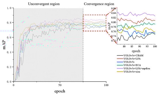 The proposed models were compared with the existing YOLOv5s, YOLOv5s+CBAM [], YOLOv5s+ECA [], and YOLOv5s+siou [] models. First, several models were trained with 1450 training set images and, by comparing the magnitude of precision, recall, mAP50, mAP50_95, Params, and GFlops values of each model, we obtained Table 3 and plotted the mAP curves of each model on one axis, as shown in Figure 8 and Table 3.