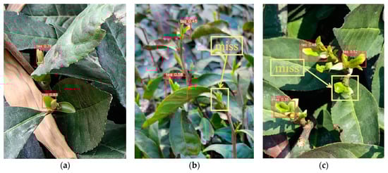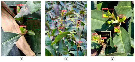 Under normal light conditions, the numbers of false detections of YOLOv5s, YOLOv5s+CBAM, YOLOv5s+ECA, and YOLOv5s+siou were significantly higher than that of the YOLOv5s+LFA+mpdiou model. In actual agricultural harvesting, people often need to determine a confidence range of the tea buds identified by the network; the higher the confidence, the higher the number of tea buds, and the more tea buds will be in line with the famous tea buds. However, if the confidence level is too high, it will cause leakage of the tea buds For the miss and false rates, the following formulas were used: