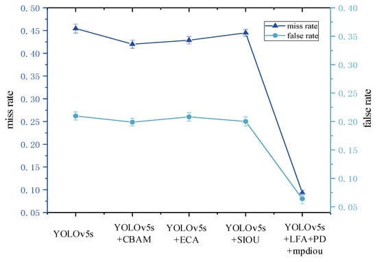 According to Equations (30) and (31), the researchers calculated statistics for the misdetection rate in the test set with a light intensity of –, and the comparison is shown in Table 4.