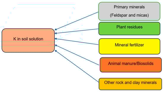In soils, potassium is primarily found in inorganic forms. It can be found in soil solutions, adsorbed to or released from clay particle surfaces, bonded in silicates, and exchangeable form [109]. The main sources of K are the rocks mica and feldspar, which release this element during weathering [118]. K exists in the soil in four different forms in dynamic equilibrium with each other [119,120,121]: