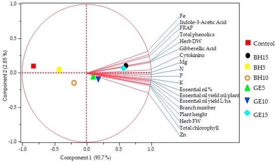 The enhanced growth and yield attributes of the sage are most likely ascribed to the increased endogenous phytohormones, essential nutrients, chlorophyll, and antioxidant capacity triggered by BH and GE application. As various nutrients markedly affect the growth and development processes in plants [46] and receiving the proper levels of nutrient elements enhances the growth characteristics in several aromatic plants [16,47,48,49], stimulating essential nutrient elements with BH or GE treatment is proposed to contribute largely to the enhanced sage growth. In agreement with the current results, improved growth and yield have been observed in Syngonium in response to BH treatment [26] and damask rose in response GE [31]. Further, Taiz and Zeiger [50] reported that auxins enhance cell elongation and stem growth, GA3 enhances cell division and elongation, and cytokinins promote cell division and modify apical dominance. We, therefore, speculate that BH- or GE-induced phytohormones markedly participated in enhancing the fresh and dry herb yield, as well as the plant height, branch number, and, consequently, biomass production of sage. Moreover, chlorophylls play a fundamental role in photosynthesis, and changes in their levels are related to the efficiency of the photosynthetic machinery and, hence, plant growth and yield [51]. Thus, we assume that the elevated chlorophyll content due to GE or BH most probably contributed to the stimulated growth and yield of the sage, which is supported by a strong positive correlation observed in the PCA between the herb yield and chlorophyll content (Figure 1).