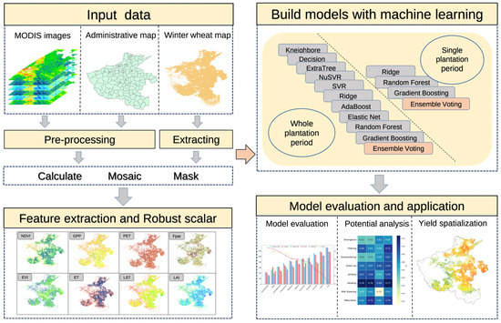 To address the aforementioned issues, this study utilized eight parameters, namely normalized difference vegetation index (NDVI), land surface temperature (LST), gross primary productivity (GPP), enhanced vegetation index (EVI), fraction of photosynthetically active radiation (Fpar), potential evapotranspiration (PET), actual evapotranspiration (ET), and leaf area index (LAI). Combining these parameters with winter wheat yield statistics, an ensemble voting model based on gradient boosting, random forest, and ridge algorithms was constructed. This study analyzed the yield prediction potential across different growth stages of winter wheat and established a spatialization model for winter wheat yield at both county and pixel levels (Figure 1).