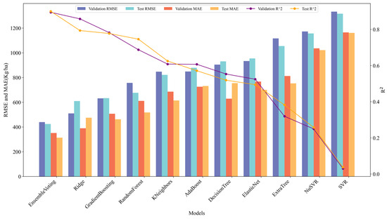 In the validation set, the ensemble voting model achieved the highest R2 value, reaching 0.90. Following closely were ridge, gradient boosting, and random forest, with R2 values ranging from 0.69 to 0.86, while other models had R2 values below 0.69. Simultaneously, the ensemble voting model obtained the lowest RMSE and MAE at 439.21 kg/ha and 351.28 kg/ha, respectively. Ridge, gradient boosting, and random forest exhibited relatively higher RMSE and MAE, ranging from 509.50 to 756.39 kg/ha and 389.66 to 611.46 kg/ha, respectively. The RMSE and MAE for other models fell within the range of 847.14 to 1332.69 kg/ha and 725.36 to 1165.48 kg/ha, respectively.