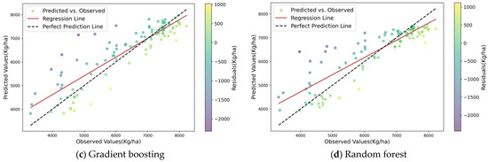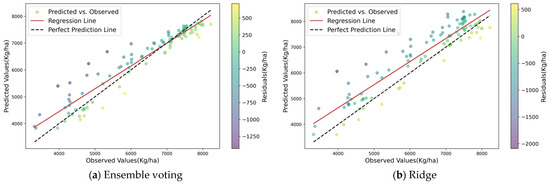 In both the validation and test sets, the ensemble voting model consistently exhibited stable predictive capabilities. Figure 9 illustrates the scatter plot and residual information for the ensemble voting model during the heading stage. The curve in the graph indicates a well-fitted linear relationship between the predicted and actual yields during the wheat heading stage.