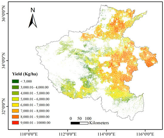 Figure 10 demonstrates the spatial distribution of winter wheat yield at the pixel scale in Henan Province. It can be observed from the figure that the high-yielding areas of winter wheat in Henan Province are mainly concentrated in the eastern region, and the yield in the western region is relatively low. In addition, the planting structure of winter wheat is more fragmented in the western region. The more concentrated distribution of high-yielding plots highlights the existence of more favorable conditions for winter wheat cultivation in the eastern region. The results of this spatialization of yields help us to more comprehensively understand the geographic variability of winter wheat yields in Henan Province and provide visual support for agricultural decision-making and management.