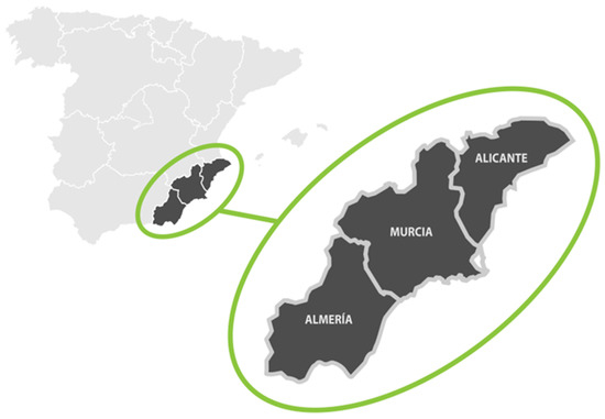 Spanish lemon production is mainly concentrated in three areas located in the SE: Almería, Murcia, and Alicante (Figure 1). Within these areas, the Region of Murcia stands out as the main producer.