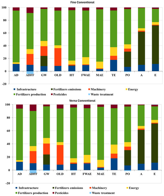 To carry out the environmental assessment of Fino and Verna production models, LCA was used. The LCA is an environmental assessment methodology that studies the life cycle of a production process and makes it possible to quantify the potential environmental impacts generated and to identify which elements contribute the most to them. It is standardized by the ISO 14040-14044 standards [14,15] and consists of four phases: the definition of objective and scope; inventory; impact analysis; and the interpretation of the results.