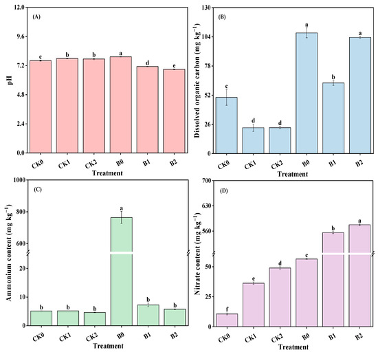 Soil properties in different treatments (mean ± SE, n = 3). Soil pH (A), dissolved organic carbon (B), NH4+ (C), and NO3− (D) contents. The same lowercase letters indicate no significant differences among different treatments.