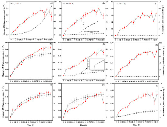 Measured N2O and N2 emissions from soil during the incubation period in different treatments (mean ± SE, n = 3). Gas emissions characteristics in B0 (A), B0-DMPP (B), CK0 (C), B1 (D), B1-DMPP (E), CK1 (F), B2 (G), B2-DMPP (H), and CK2 (I) treatments.